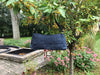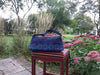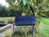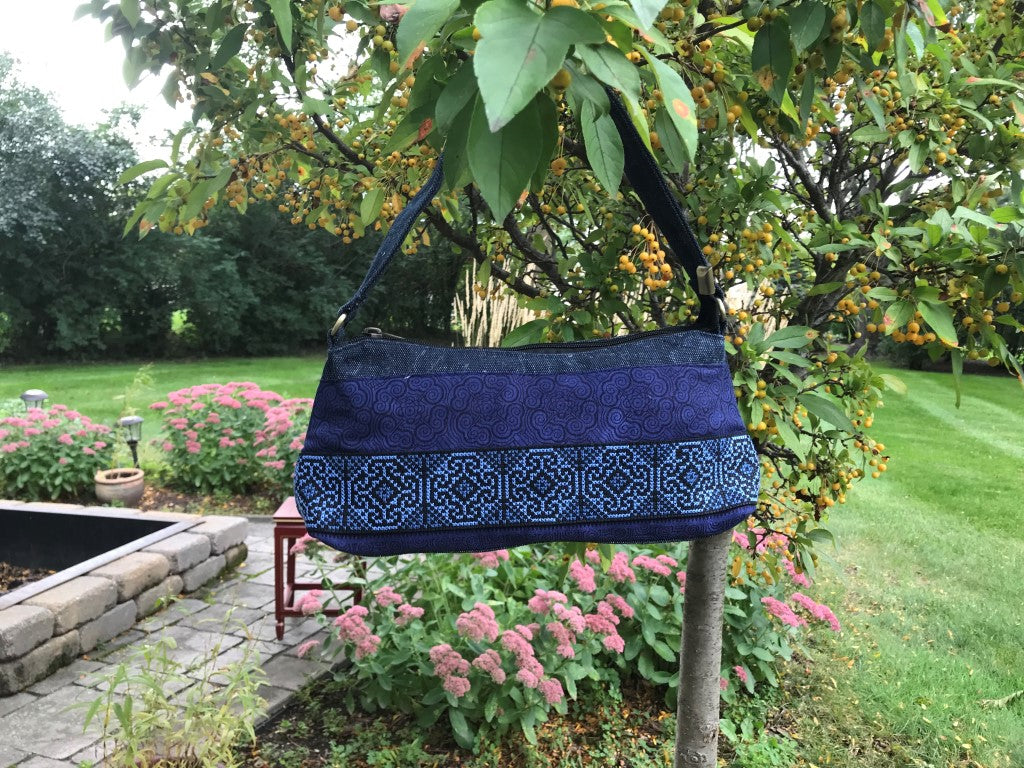 Stylish, one-of-a-kind, and totally you! This denim mini-bag with a sassy, short handle has a blue hand-made batik patch across the front with matching hand-created cross-stitch work in blue. Don't be deceived by the mini-bag label - there is plenty of room for everything you need: your largest smart phone, keys, a wallet, handy cosmetics, and anything else you want to take along.