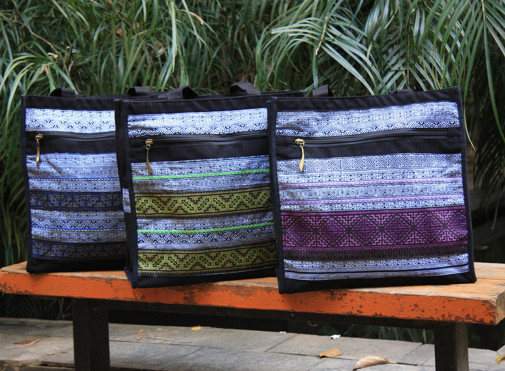 This beautiful black square small tote comes with colored hand cross-stitch and hand-made hemp fabric bands - this is fast becoming a lost art among the Hmong villagers.