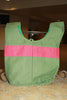 The "Spring Flower" medium sling bag has a snap pocket in the front, two pockets in the back, and a zippered pocket inside. There is a tie closure with coordinating fabric "bells" on the ends. It has a thick, long strap to wear cross-body and a large cross-stitch patch on front, hand-embroidered.